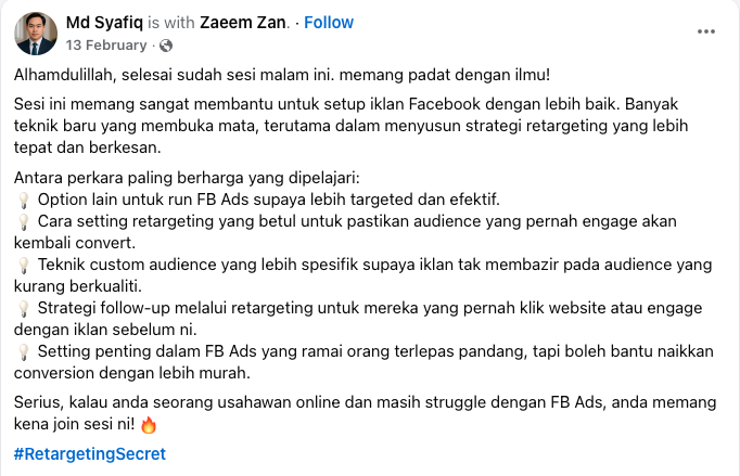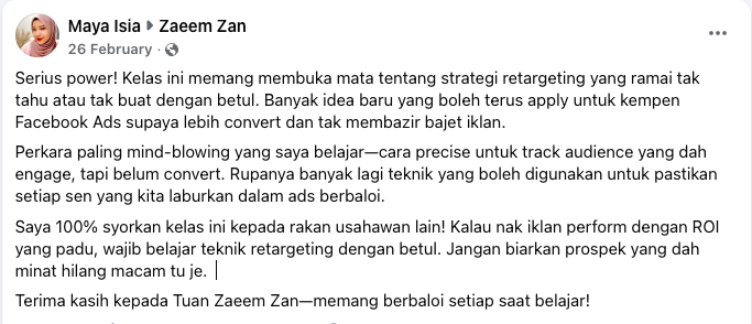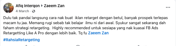 Data menunjukkan bahawa retargeting menghasilkan conversion rate jauh lebih tinggi berbanding broad targeting. Ini membuktikan bahawa kejayaan iklan bukan hanya pada design atau copywriting salespage, tetapi pada kualiti audience yang dihantar ke page.