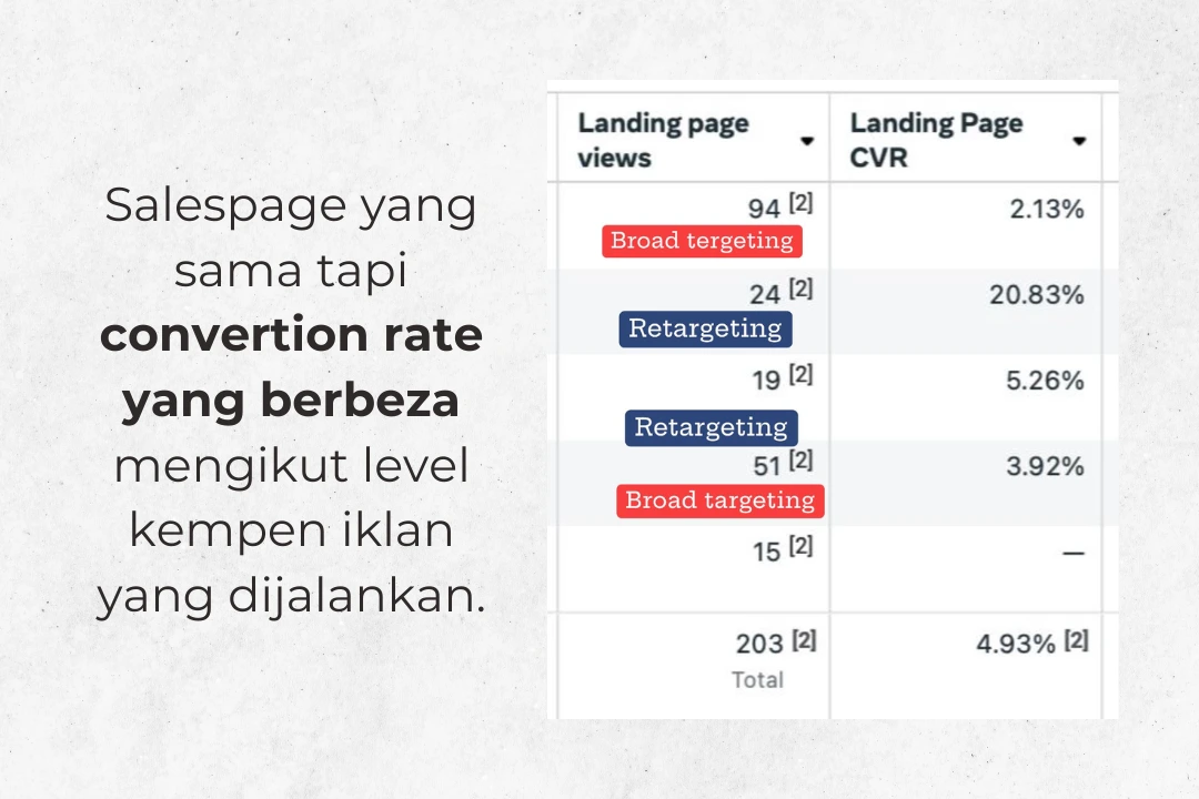 Walaupun salespage yang digunakan adalah sama, conversion rate yang terhasil berbeza-beza mengikut tahap audience yang melihat iklan tersebut.